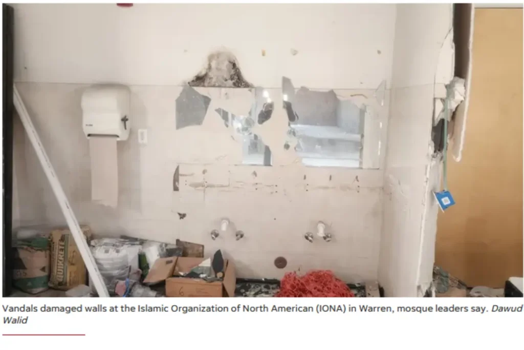 Steve Elturk, president of the Islamic Organization of North America (IONA), located on Ryan Road, said he’s unsure what motivated the vandal or vandals to come onto the property, damage walls, break windows, and spray-paint ambiguous messages on the floor and equipment for an ongoing expansion project. But he’s calling on Warren police to investigate it as a potential hate crime.